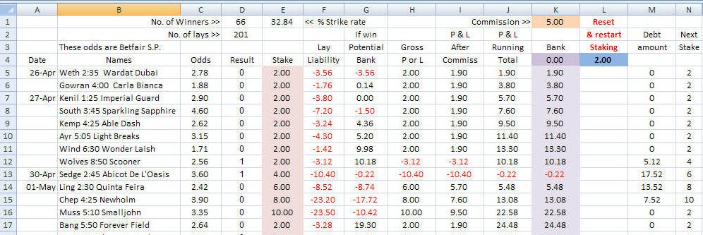Note that the total lays in this sheet were 201, with 66 of those hitting a winner. . . . shown at D1 & D2, for a strike rate of 32.84% of winners.