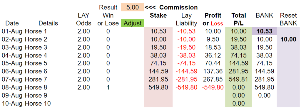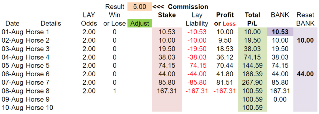- When we eventually hit a winner with one of our lays, we lose what is in our Bank column at that point.