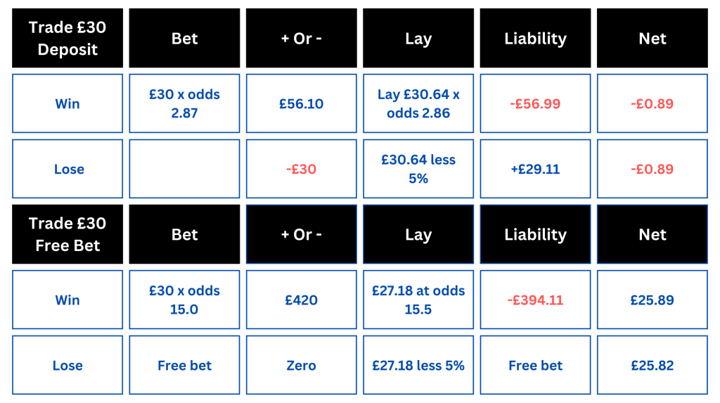 That is 83.1% net profit on the initial £30 deposit from the 2 trades combined – the equivalent of a winner at odds of almost 5/6, with no risk.